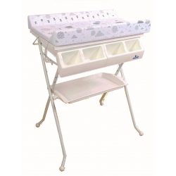 Bañera con estructura de metal y cubeta de plástico de 2 etapas grande con antideslizante, cestilla de tela (sobre bidet) y cambiador abatible. Se puede utilizar como cambiador y bañera. Incluye todos los accesorios tales como desagüe, cubeta vestidor, jabonera y cestilla. Bañera cubeta doble etapa. Patas metálicas en forma de tijera. Cestilla de gran capacidad. Ata para Bidet y water por los cuatro lados. Vestidor muy acolchado.